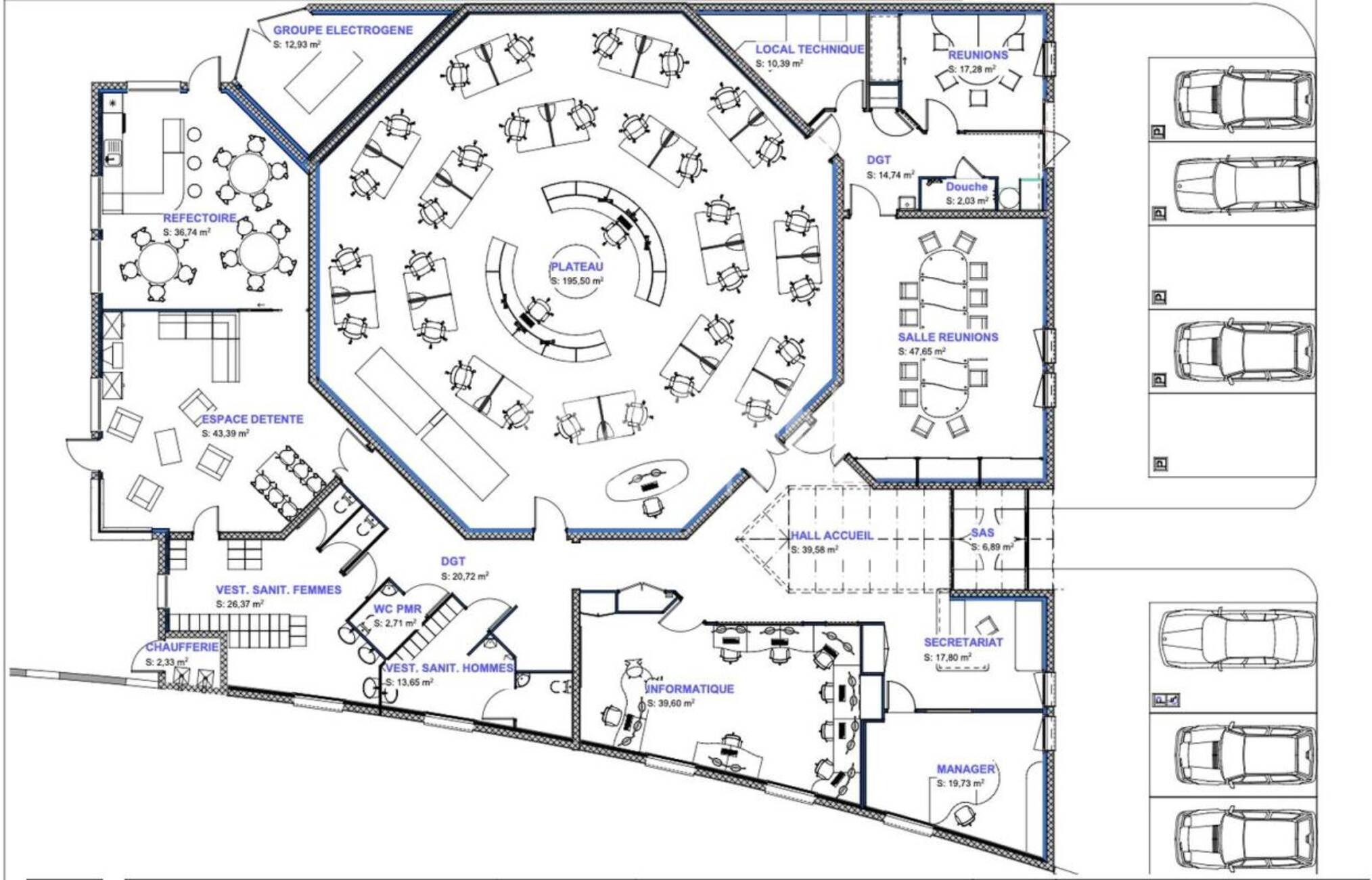 - Espaces techniques et locaux de services (salle serveur, locaux annexes.)