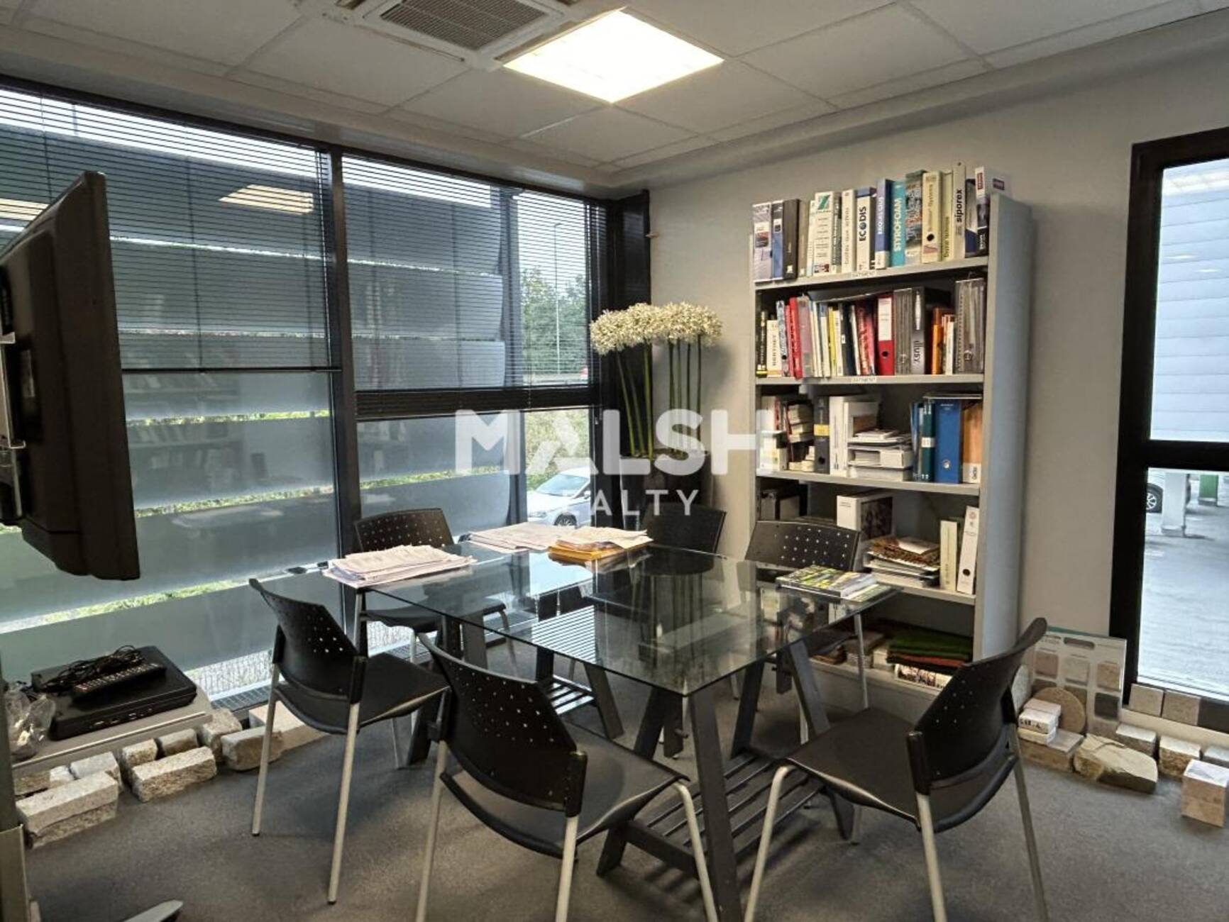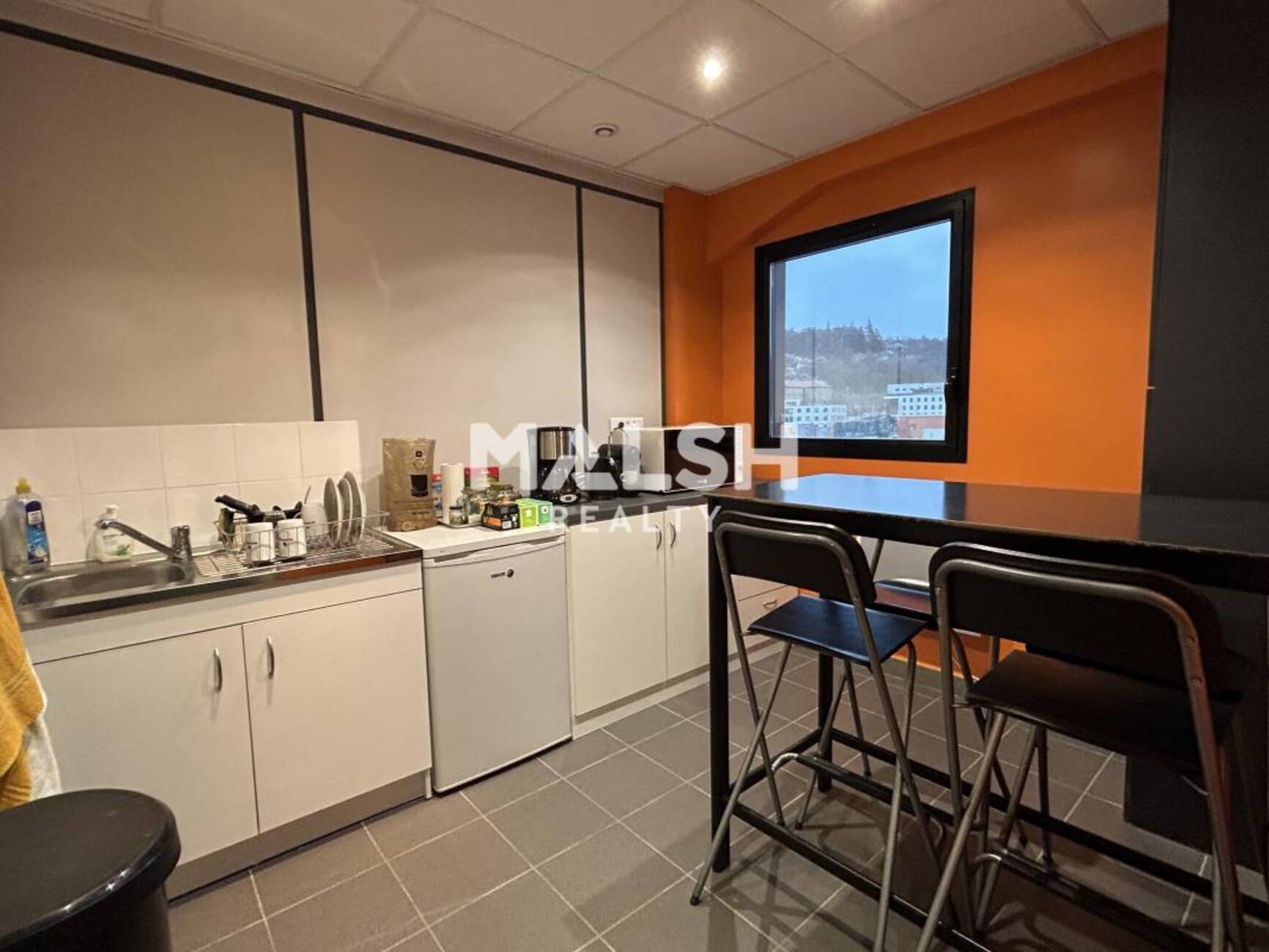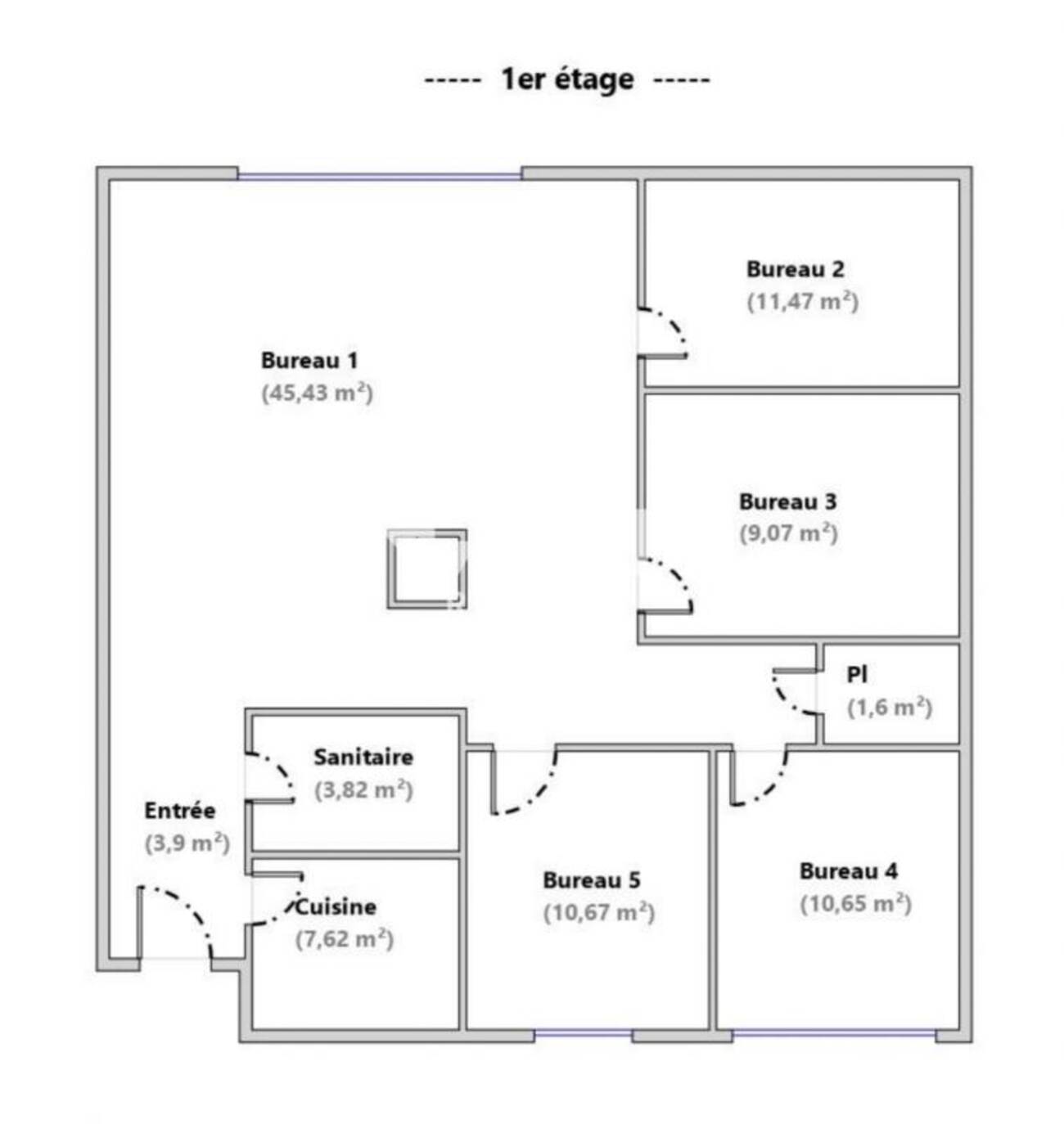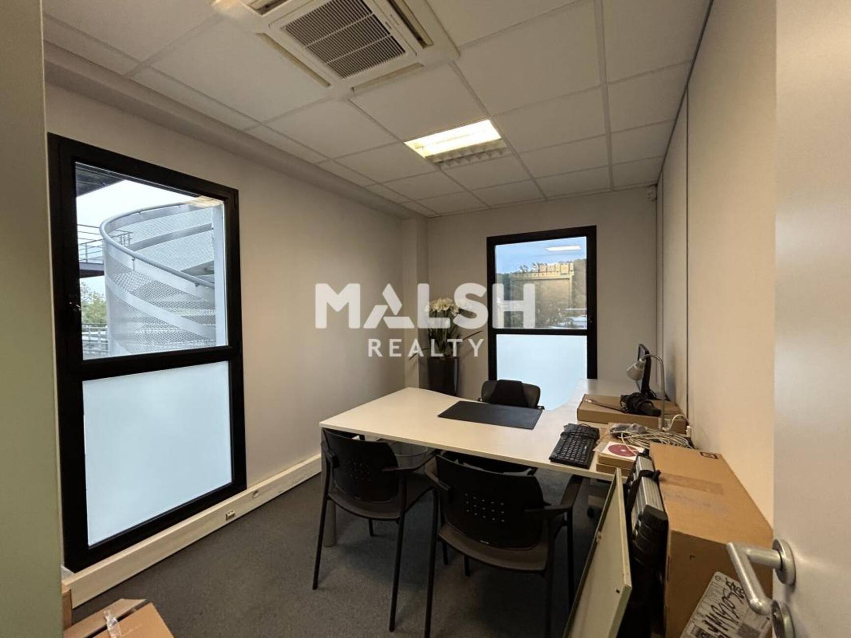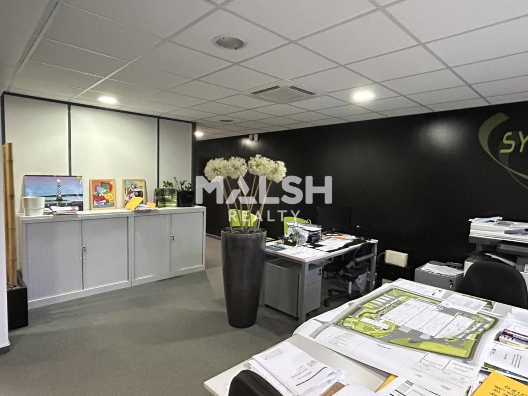 - Cloisonnement amovible : un grand open space, 3 bureaux individuels, une petite salle de réunion, une kitchenette équipée