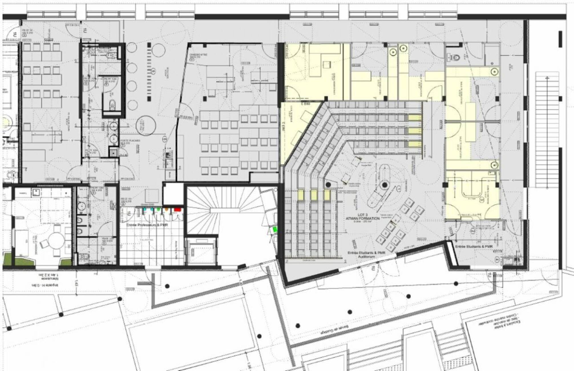 Les locaux sont composés comme suit : 6 bureaux cloisonnés, 3 salles de formation de 34 m², 48 m² et 90 m², ainsi que des sanitaires.