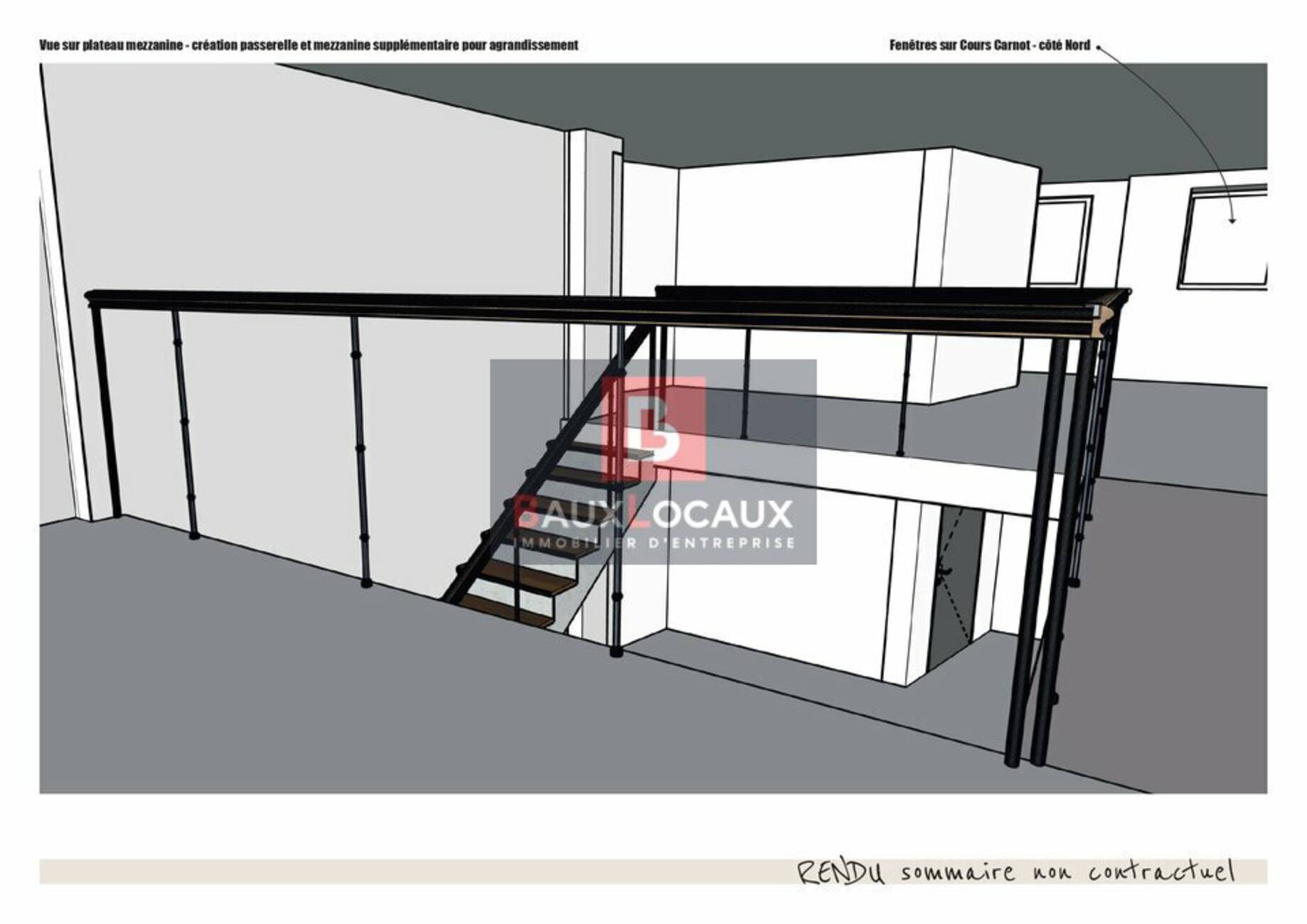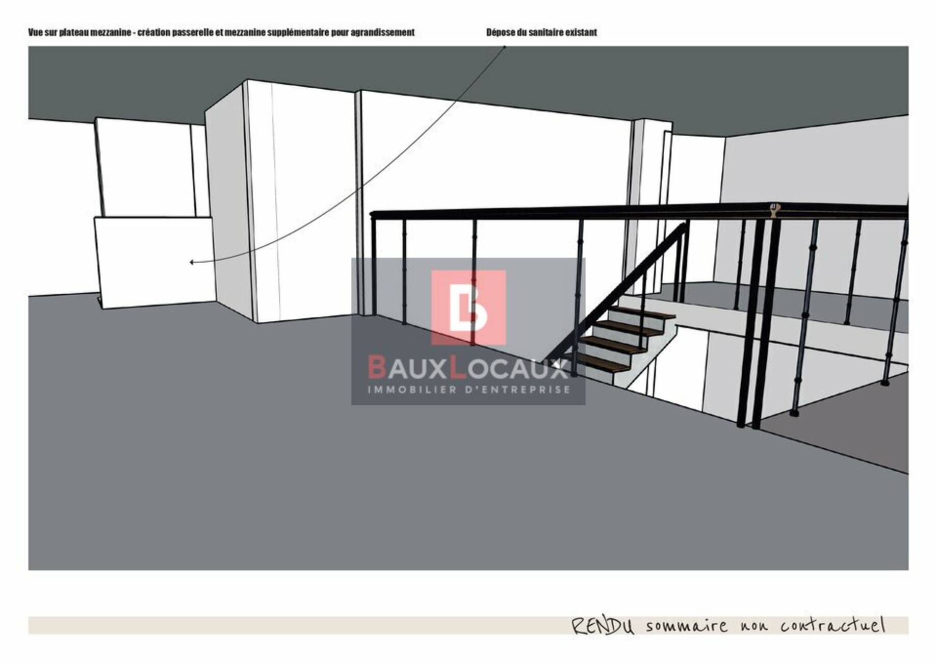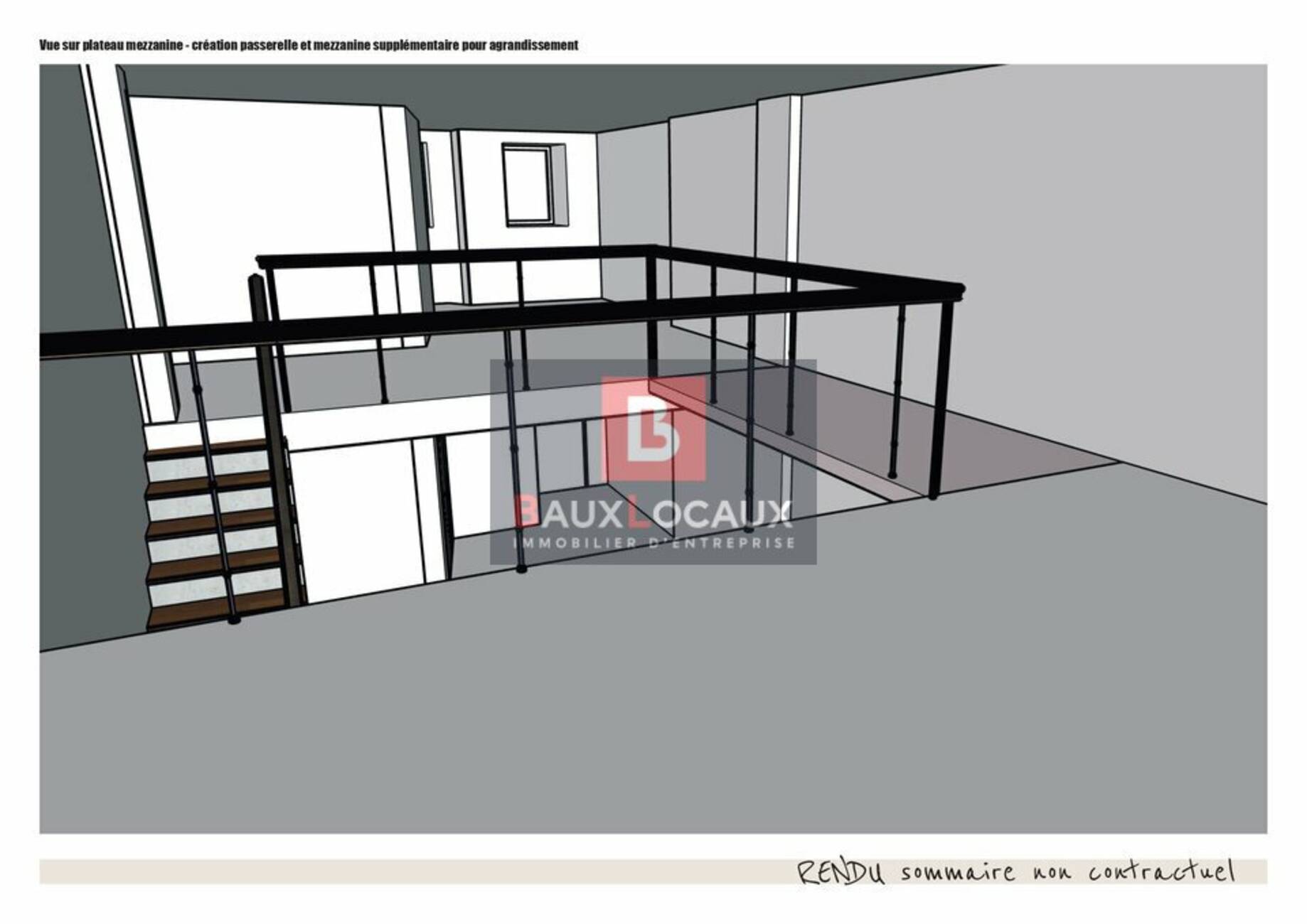- Mezzanine : environ 57 m², accessible par un escalier en métal
