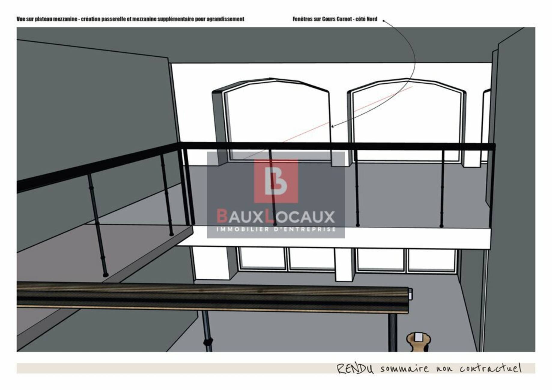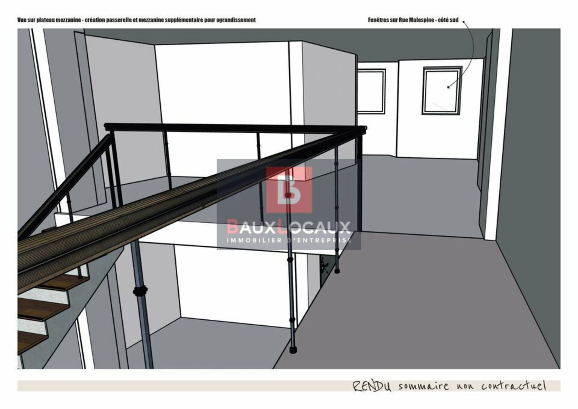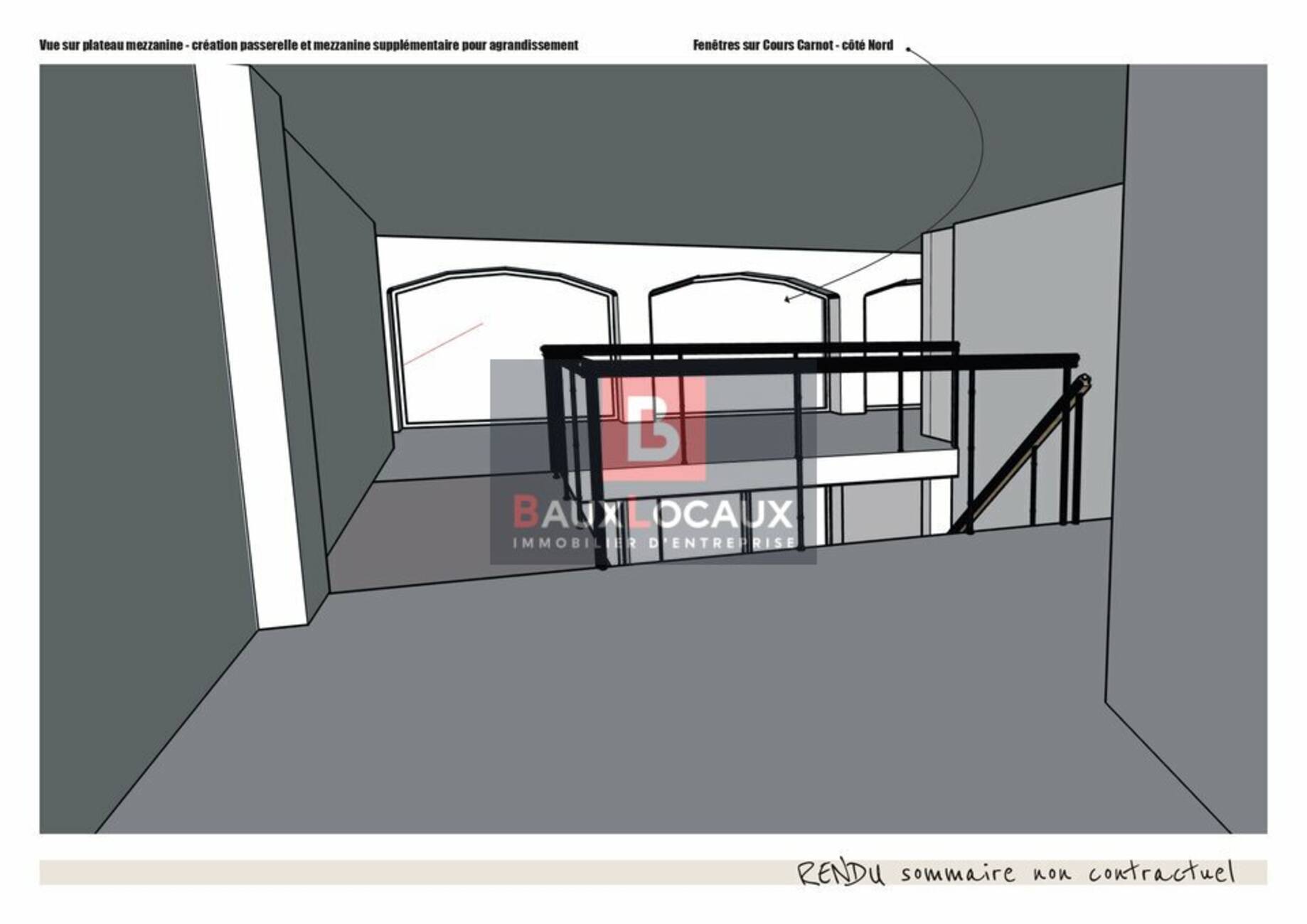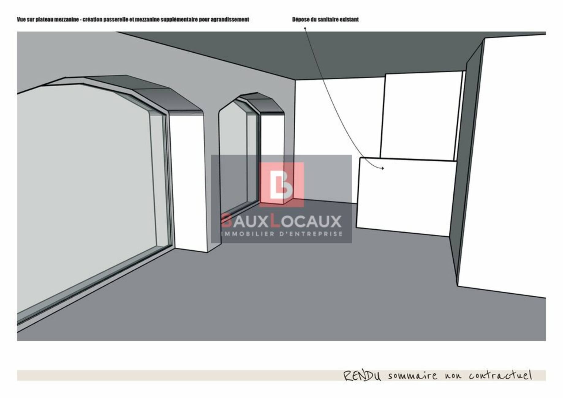 - Mezzanine : environ 57 m², accessible par un escalier en métal