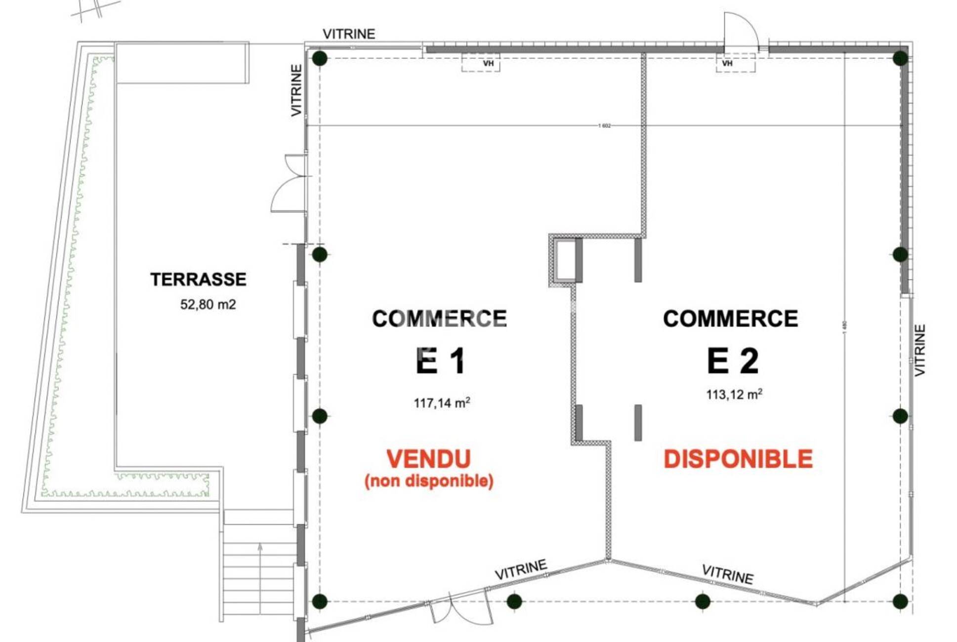 MALSH Realty & Property vous propose un local commercial de 113m² livré brut de béton fluide en attente. Le local disposant d'une gaine d'extraction la restauration est possible.