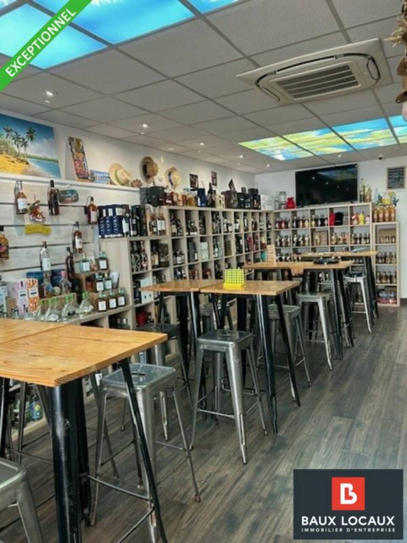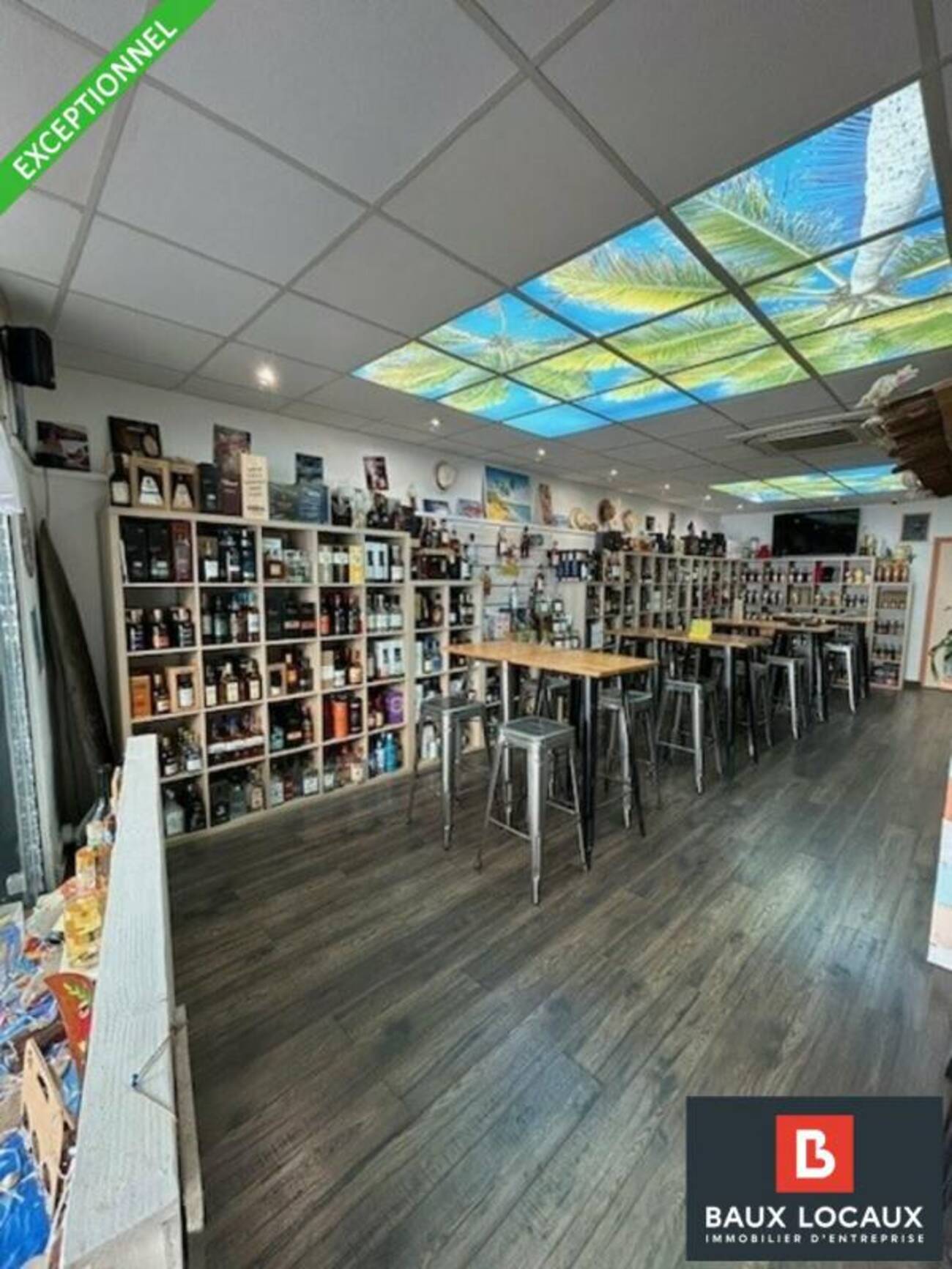 - D'1 point de vente d'une superficie d'environ 50 m², entièrement équipé d'étagères, d'un bar de dégustation, de tables. Un très beau faux plafond illuminé au couleur des Antilles, agrémente ce magasin en excellent état général.