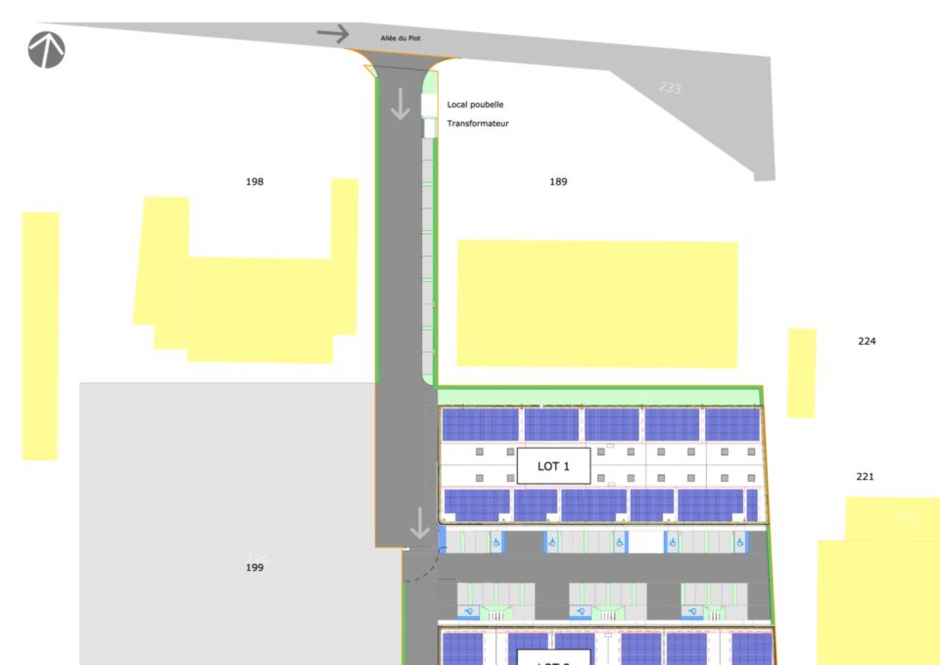 Batiment - Lot | Type | Surfaces RDC + mezzanine | Prix de vente net vendeur | Parkings |