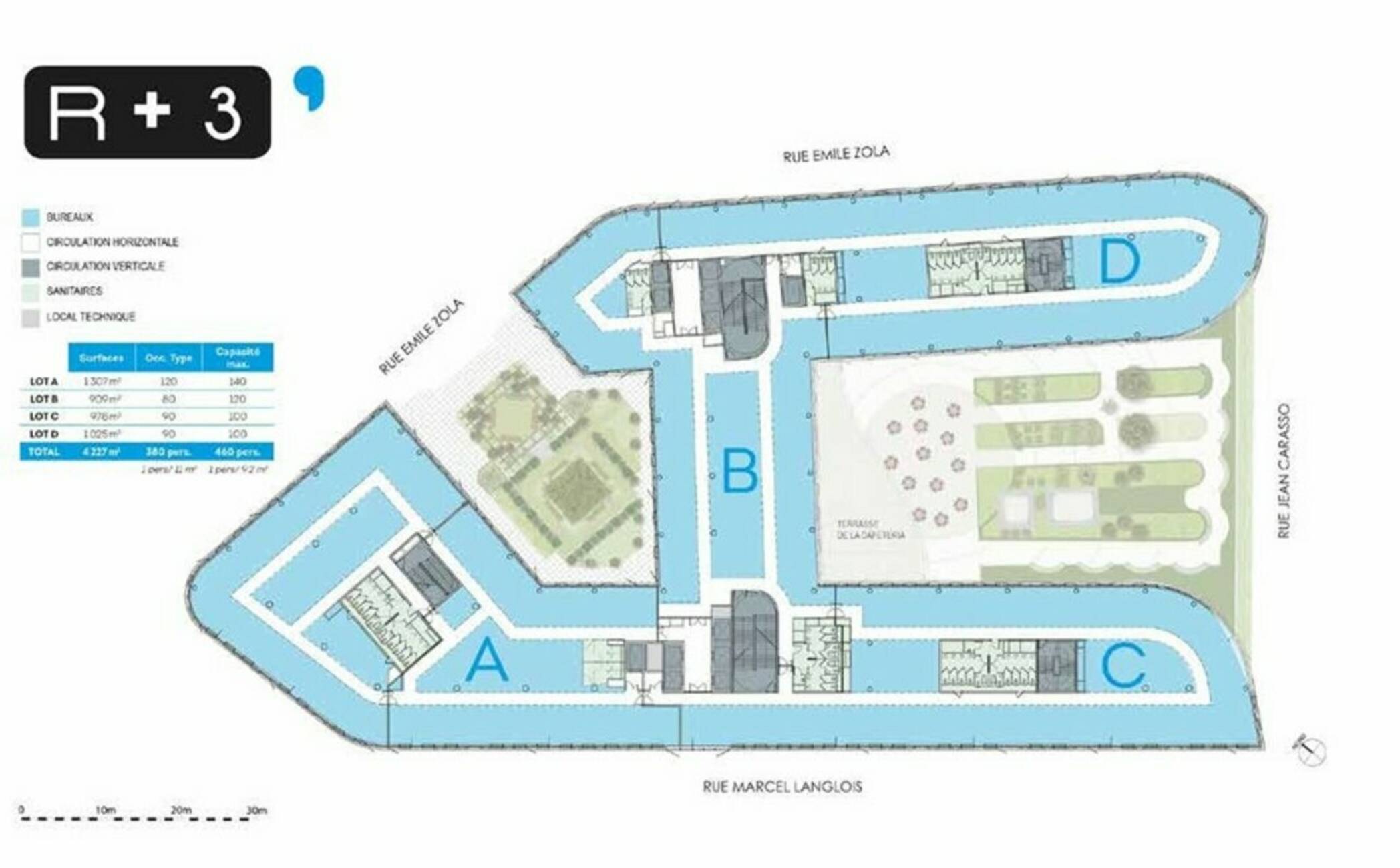 | Lot A | R+3 | Bureaux | 1 307 | possible | 280 €/m² | 80 €/m²/an | immédiate |