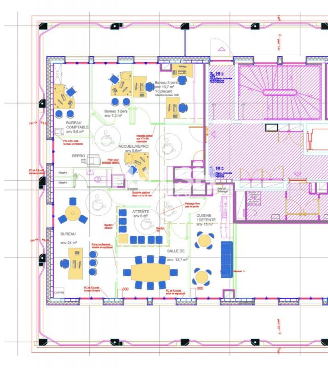 - Un accueil, 4 bureaux individuels, un bureau double, une grande salle de réunion, un espace réfectoire équipé, un sanitaire privatif.
