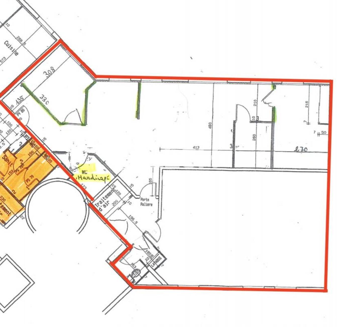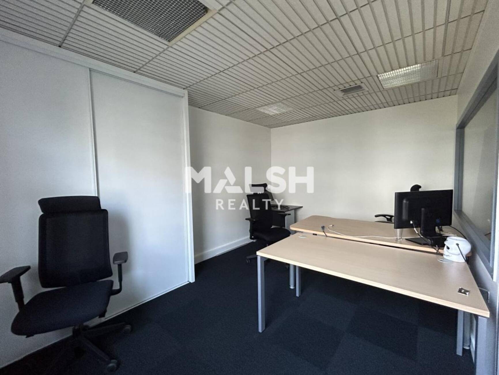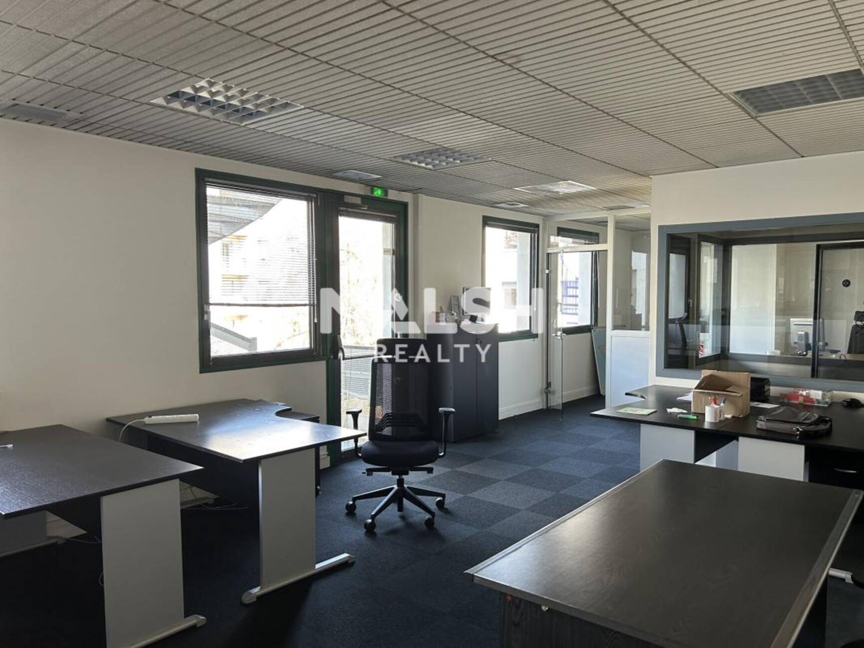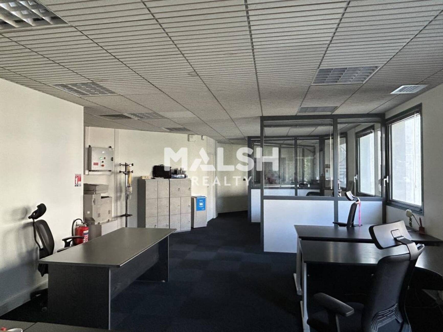 - L'autre donne accès à un lot cloisonné : 1 bureau individuel, 1 salle de réunion, 1 local informatique et 1 grand open space.