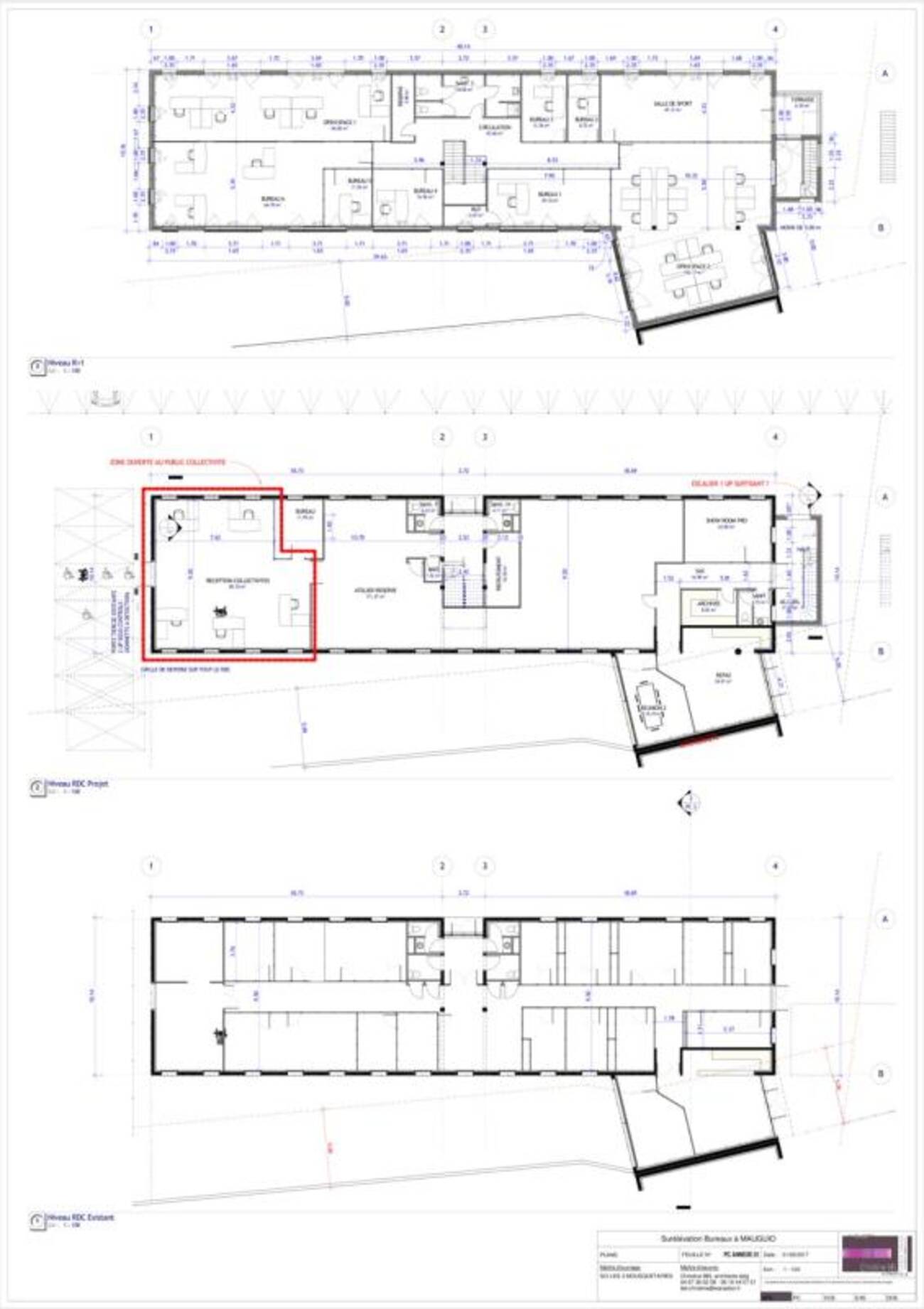 - Au R+1 : 5 bureaux cloisonnés, 3 open spaces, une réserve, sanitaires et une salle de sport avec accès à une terrasse d'environ 7 m².