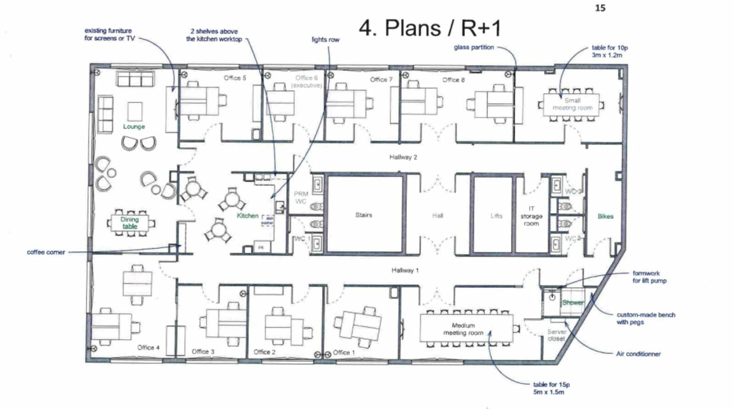 Les locaux se composent de 8 bureaux cloisonnés, de deux salles de réunion, d'une salle de repos, d'un espace de restauration avec cuisine, ainsi que de sanitaires avec douche.