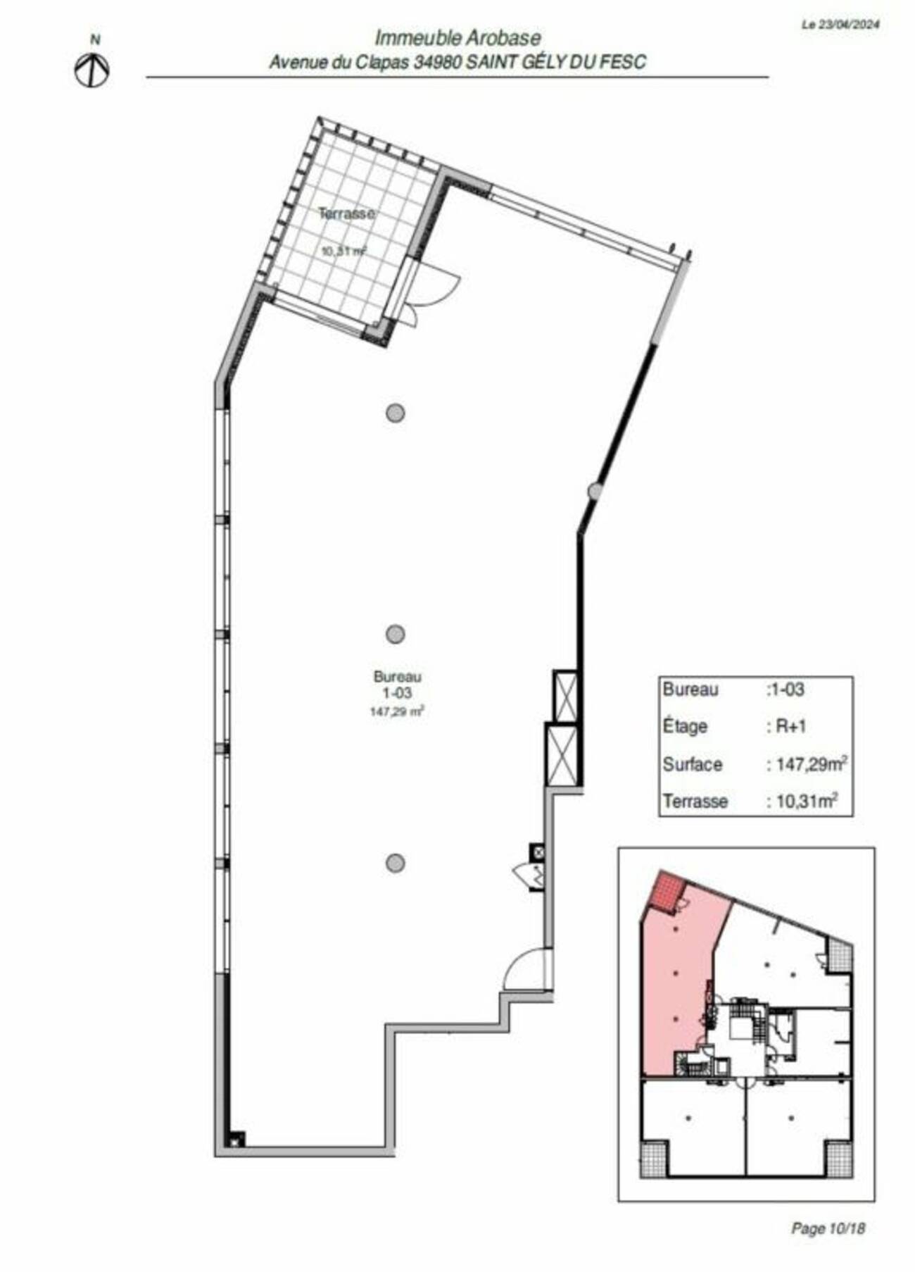 | 1-05 | R+1 | BUREAUX | 147 m²+ 10.31 m² de terrasse | 25 725 € | 25 € HT/m² | 3 en ss-sol + 1 extérieur + 1 ext couvert | 4 860 € |