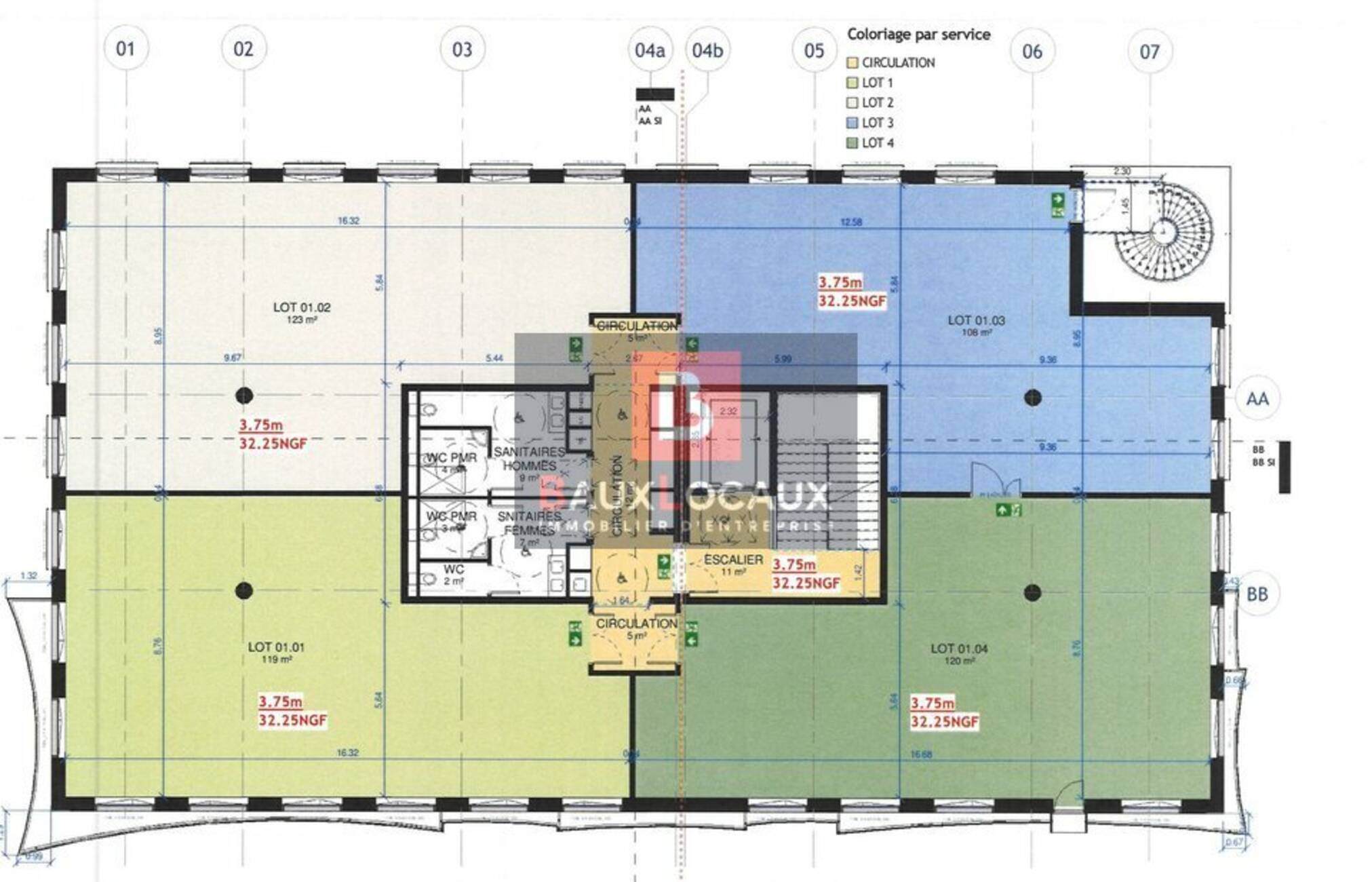 Vous disposerez également des parties communes de l'étage qui sont composées de 2 douches PMR, 3WC dont 2 PMR, ainsi qu'un sas avec escalier et passage de circulation.
