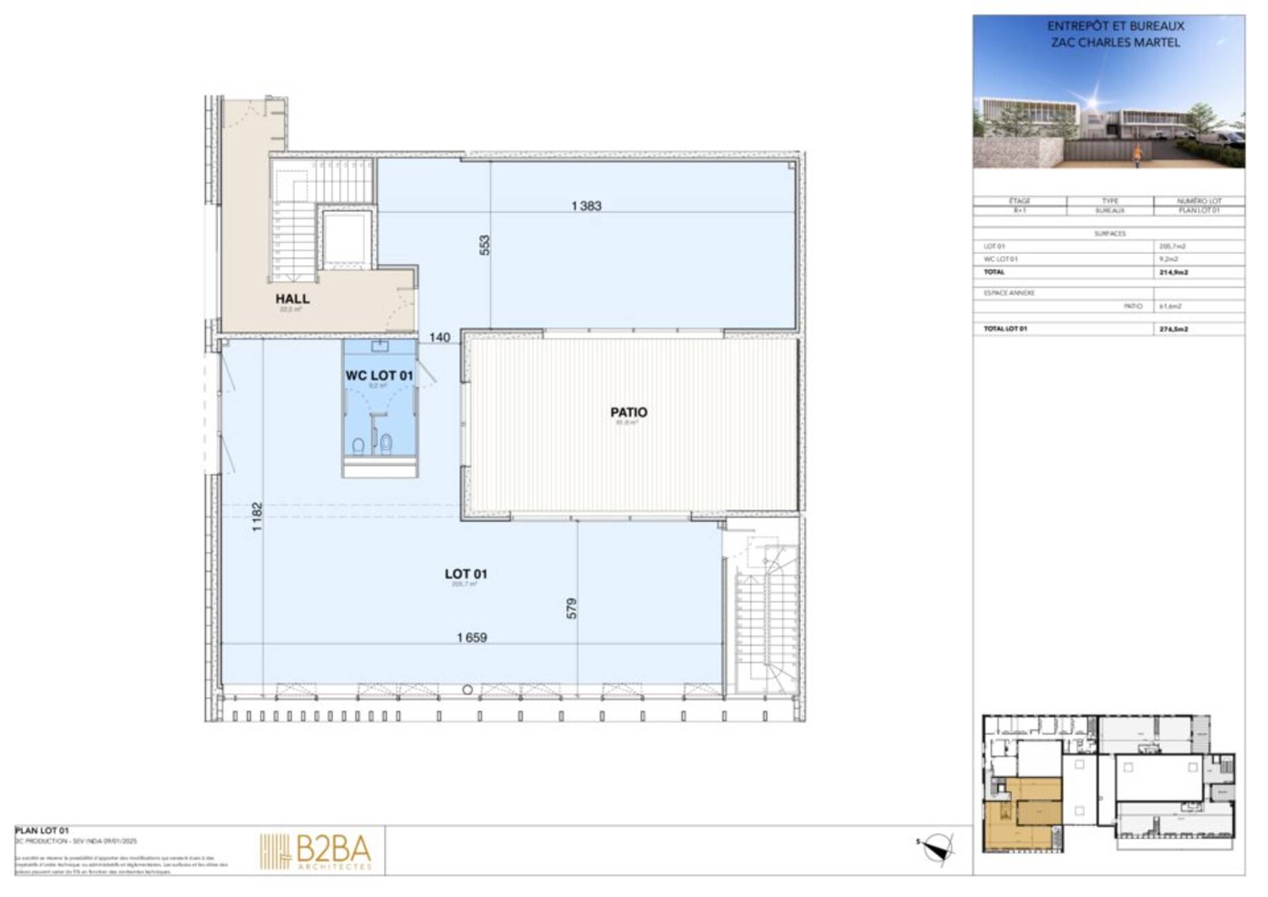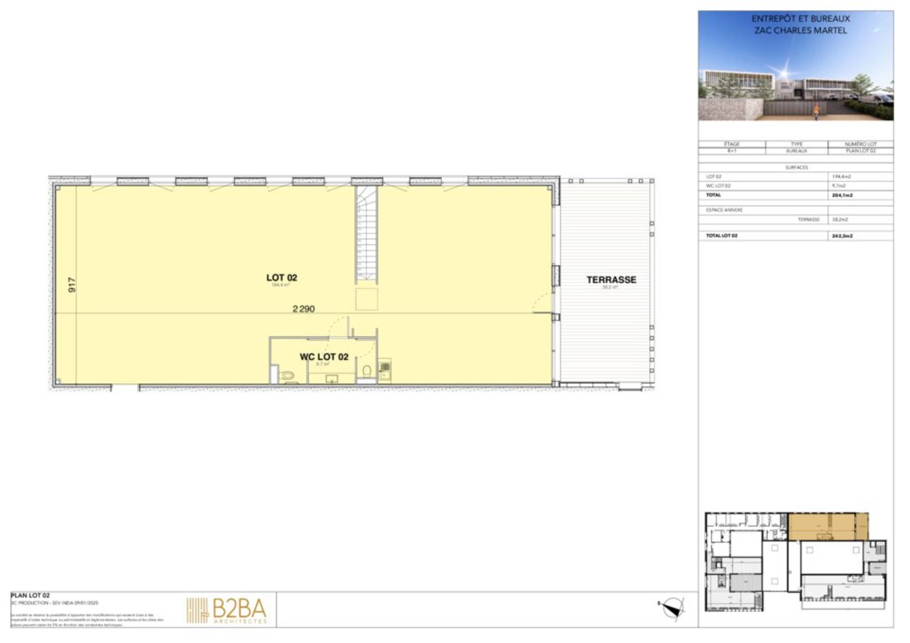 | LOT 2 | R+1 | BUREAUX | 204 m² + Terrasse 38 m² | 30600 € HC/HT | A DÉFINIR | 6 |
