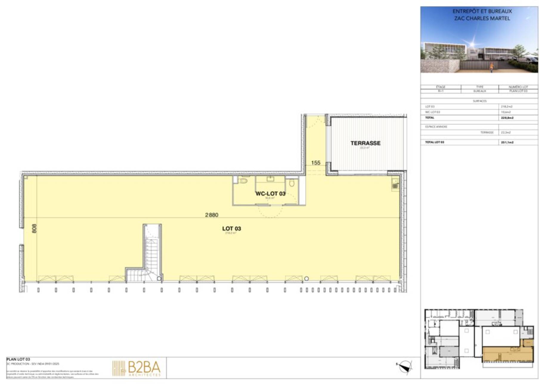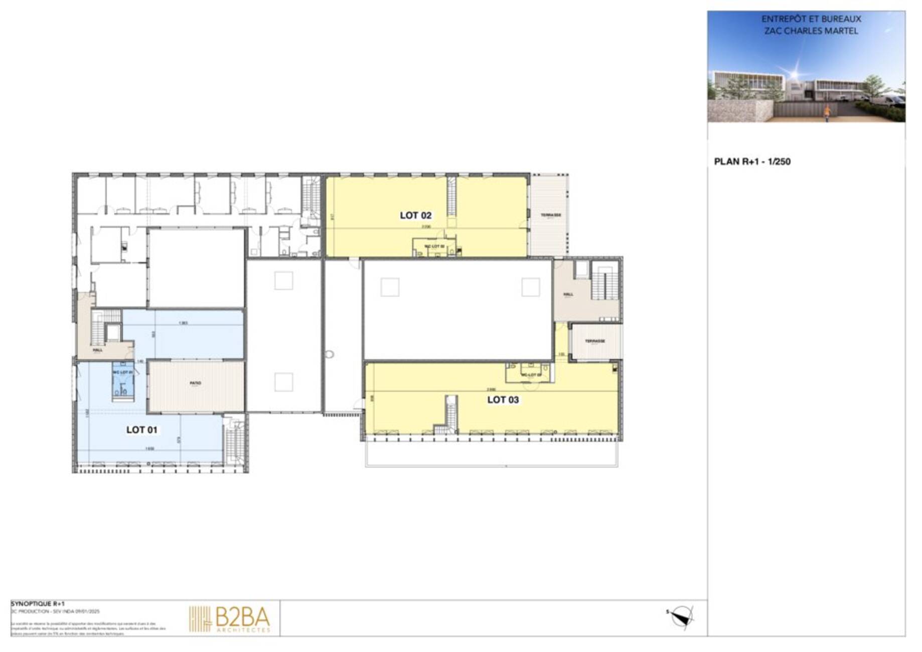 | LOT 3 | R+1 | BUREAUX | 228 m² + Terrasse 23 m² | 34200 € HC/HT | A DÉFINIR | 6 |