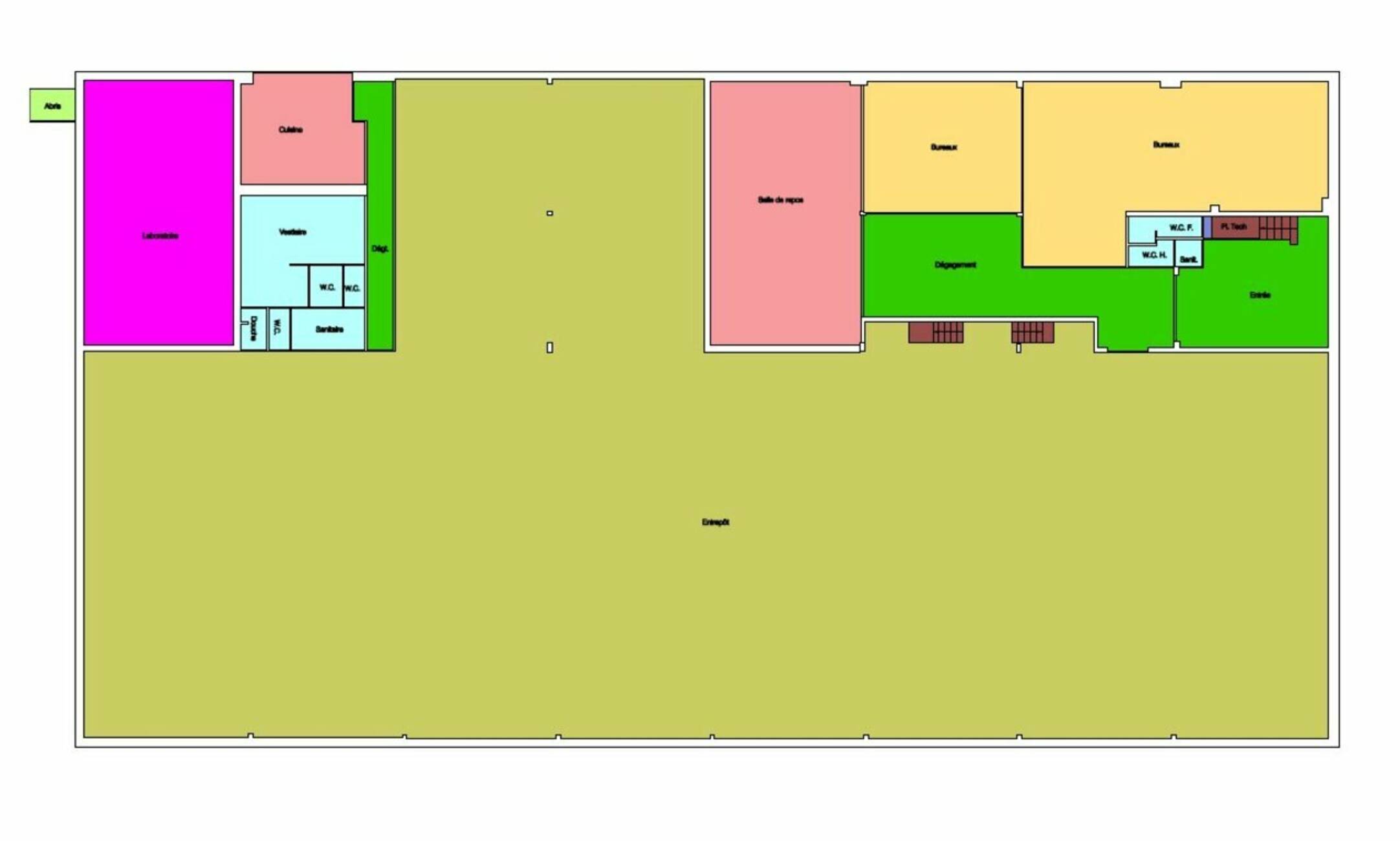 | Etage | Bureaux | Entrepôt | Locaux sociaux | Sanitaires | Circulations |
