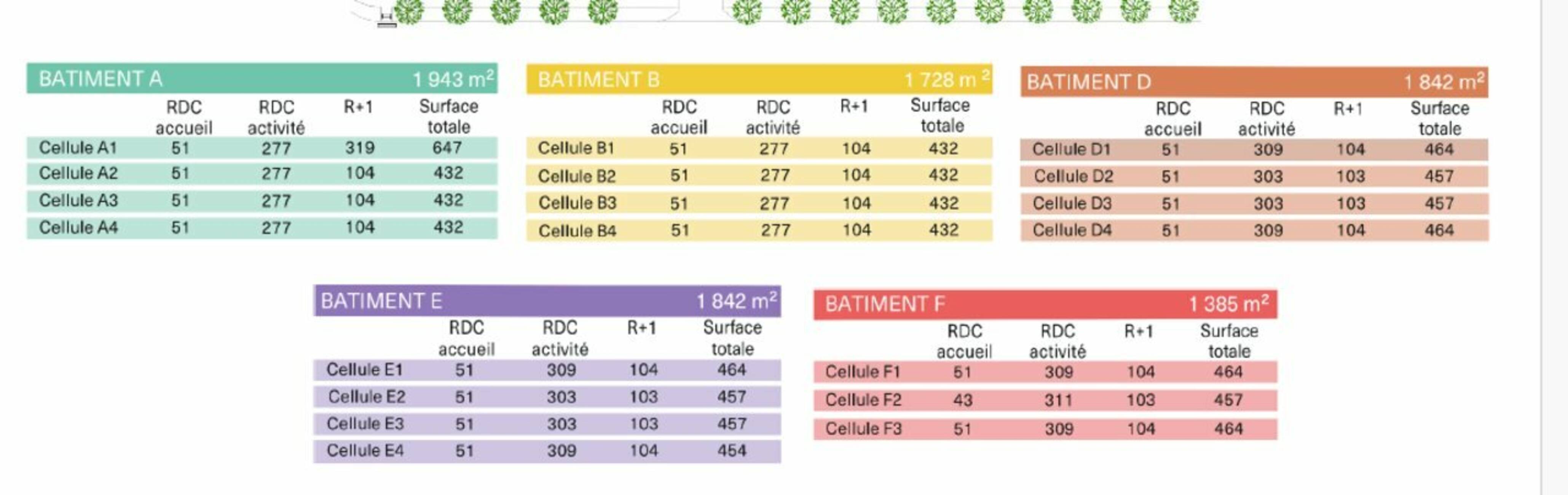 | Batiment D | Activités | Bureaux | Surface globale | Disponibilité | Parkings |