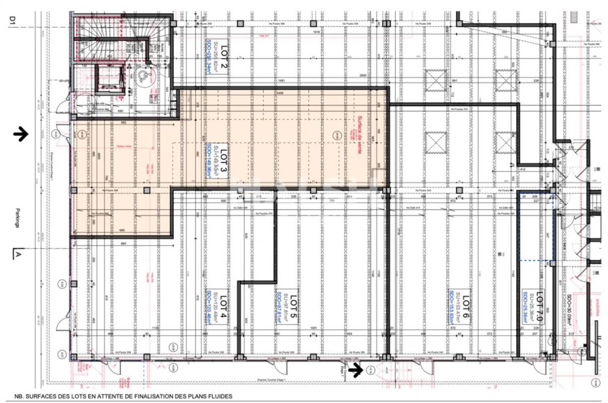 - 1 place de parking en R-1 attribué à ce lot