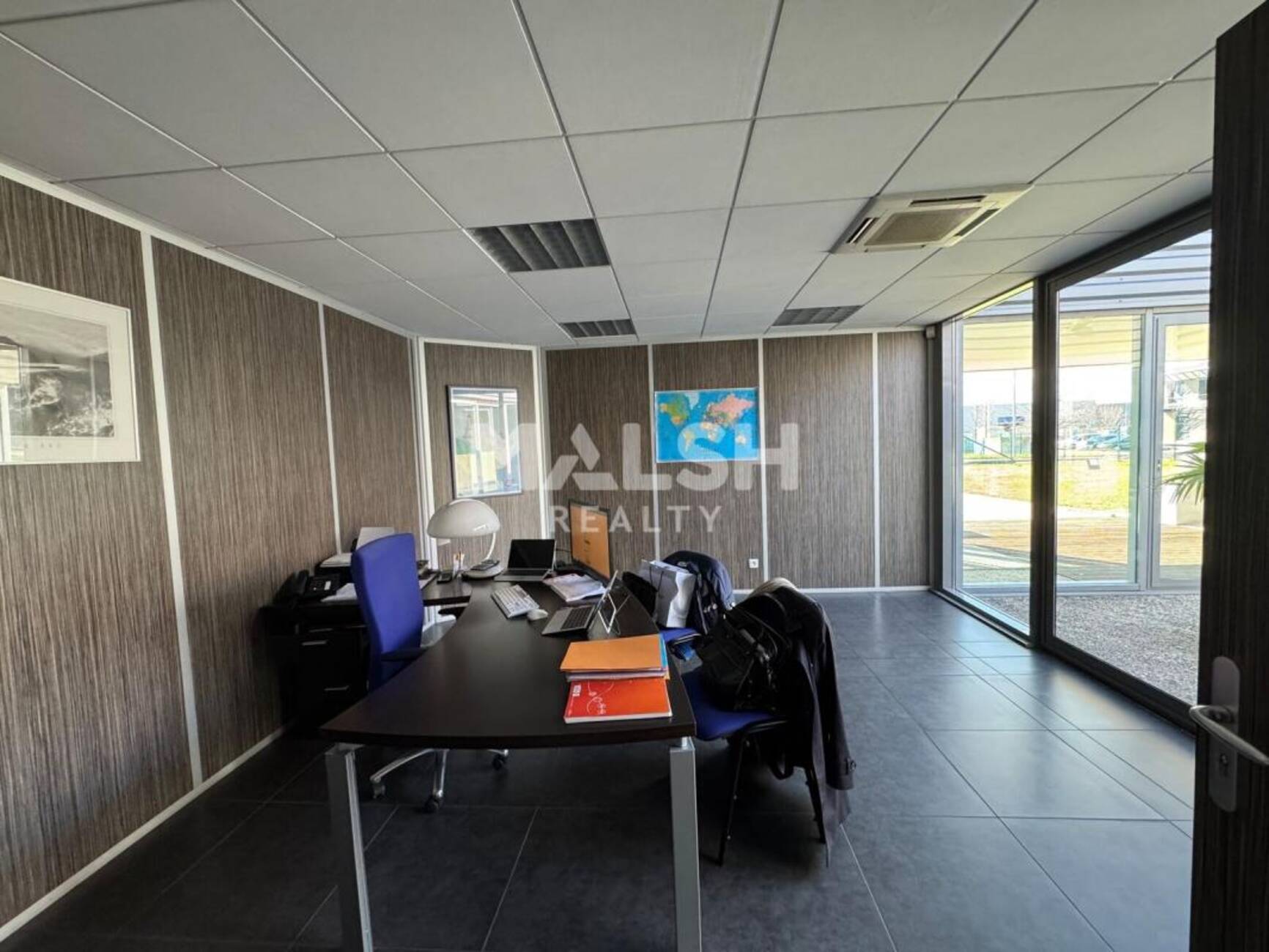 - 1 accueil, 5 bureaux, 1 open space (bureau d'étude), 1 salle de réunion, archives, réfectoire et sanitaires H/F, patio aménagé de 45 m²