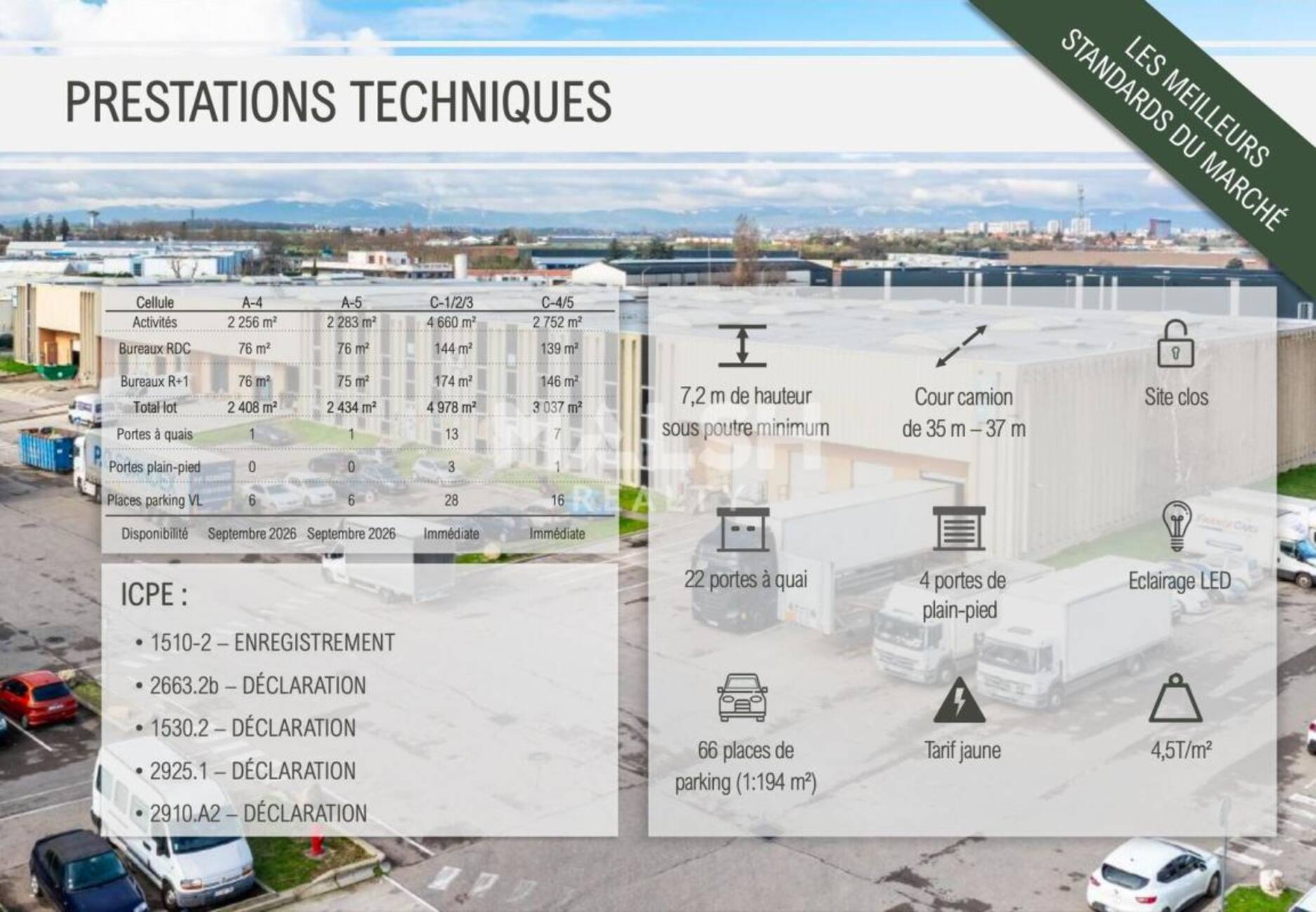 MALSH Realty & Property vous propose à la location, au sein d'un parc logistique à Corbas idéalement placé, des cellules d'activités rénovées et équipées de nombreux quais, d'une surface totale d'environ 12 857 m² divisibles en 4 lots à partir de 2 408 m².