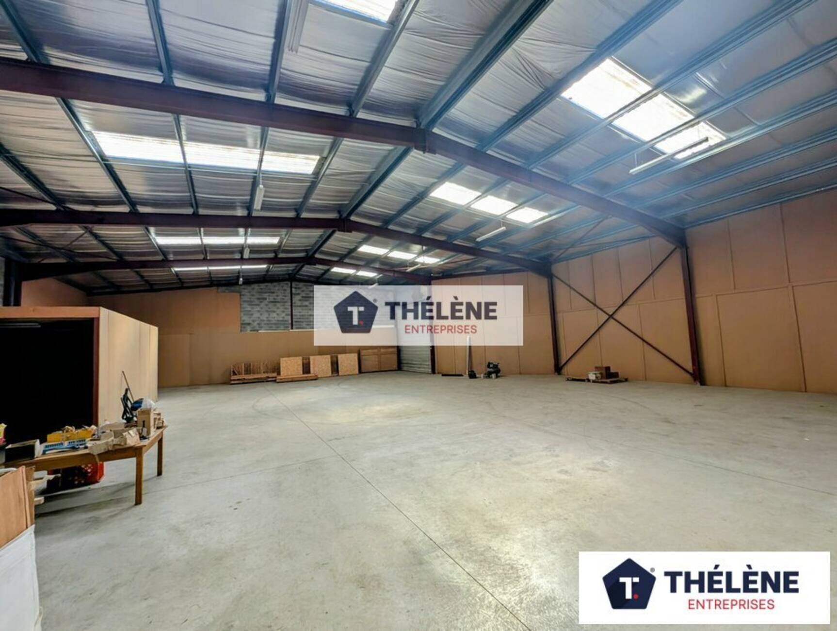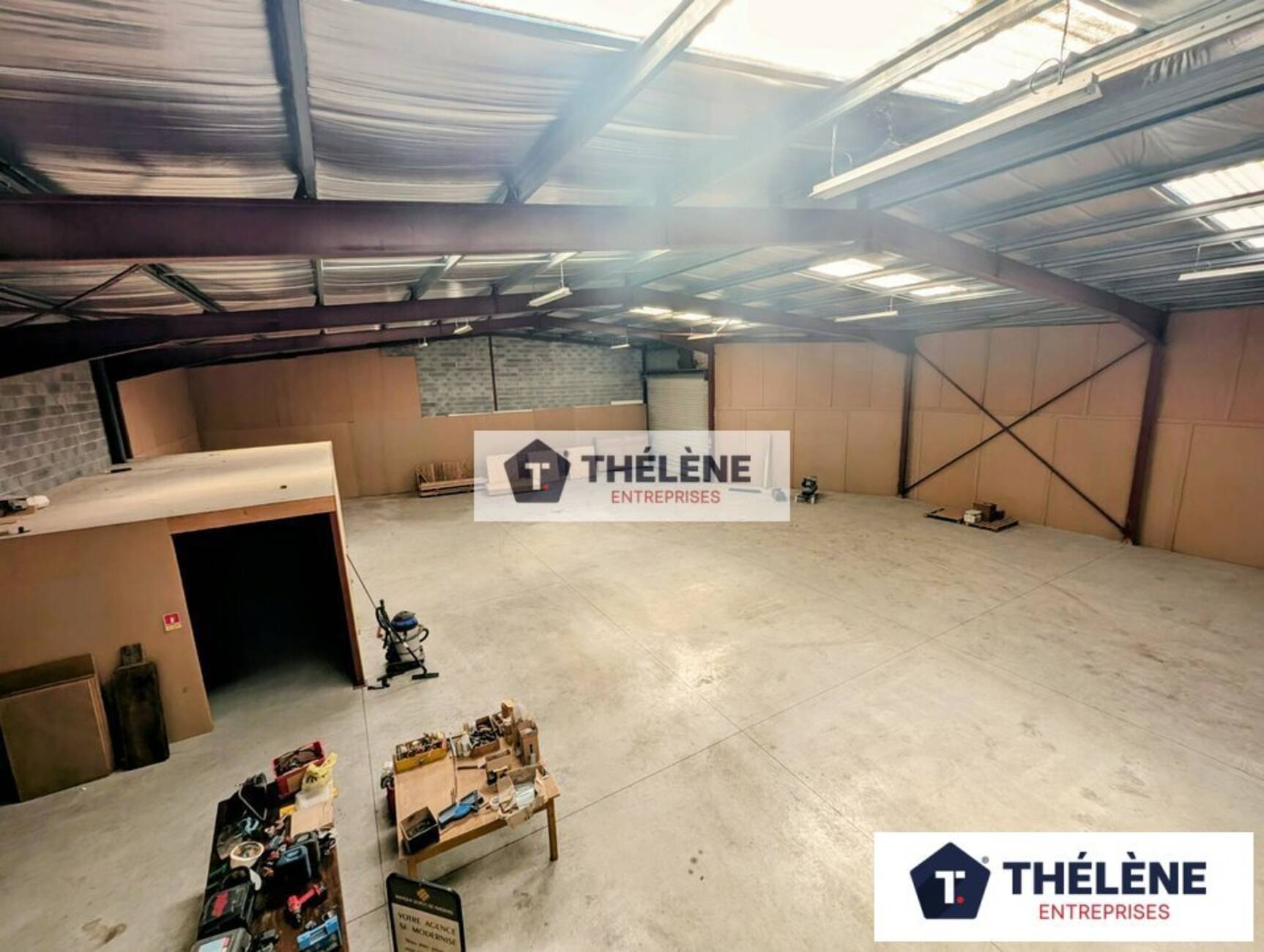Partie entrepôt RDC d'environ 740m² en construction charpente métallique avec HSP de 56 à 6.6 mètres. Toiture bac acier isolé, murs parpaings et bardage isolé par laine de verre de 120. Dalle béton au sol. Triphasé. Sanitaire, kitchenette et douche.
