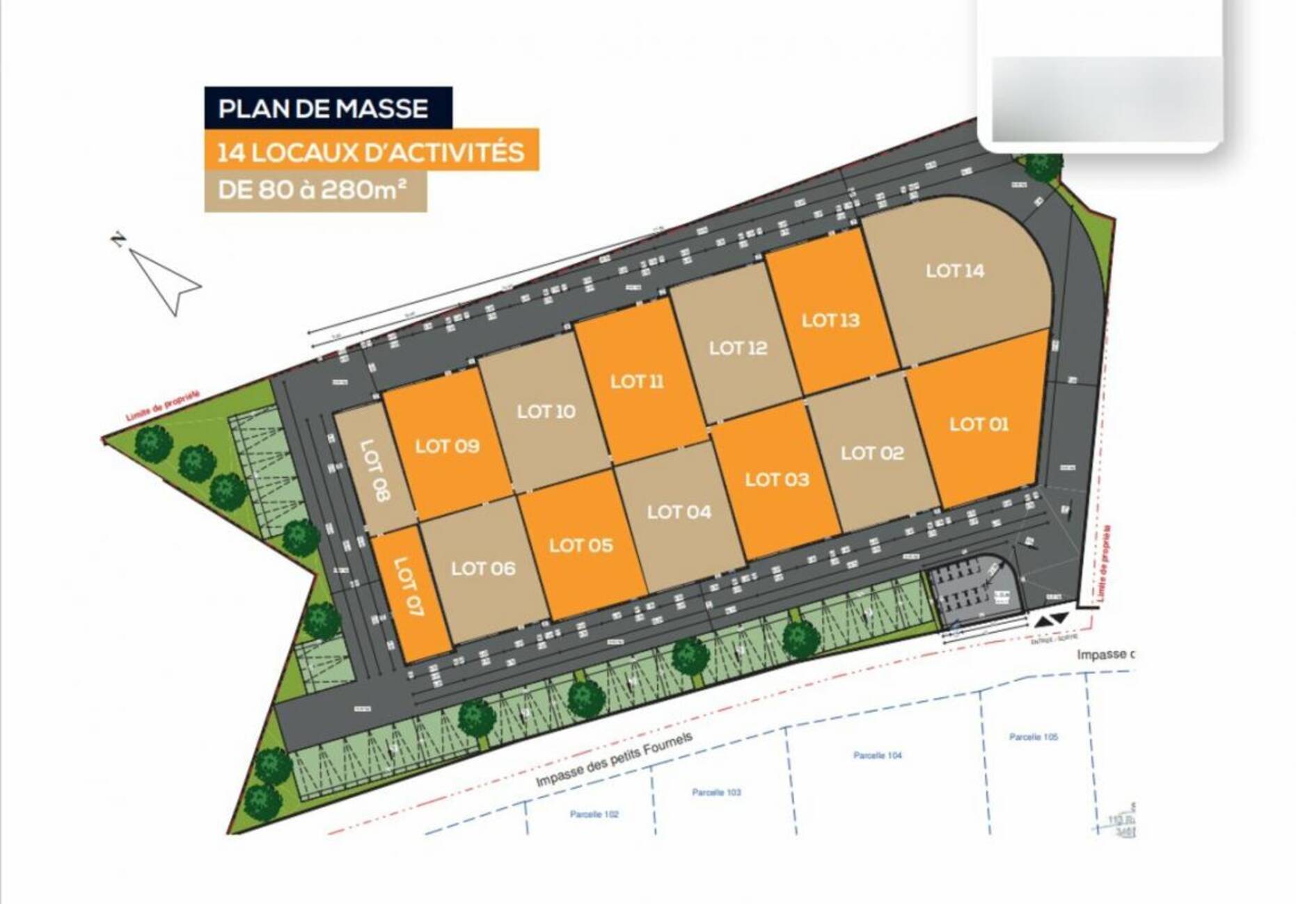 | LOT 11 | RDC + MEZZANINE | LOCAL D'ACTIVITE | 103 m² | 70 m² + 33 m² mezzanine | 120 Euros HT/m²/anparking inclus | 1 |