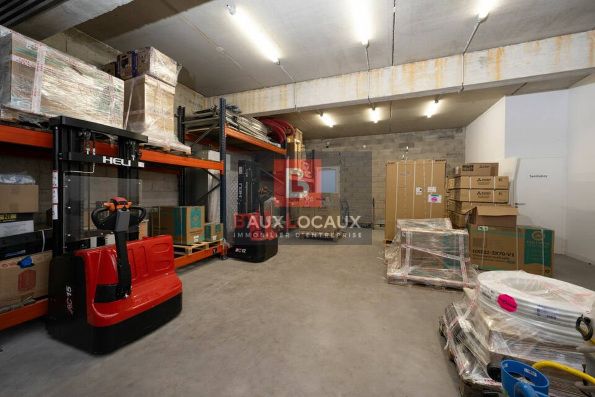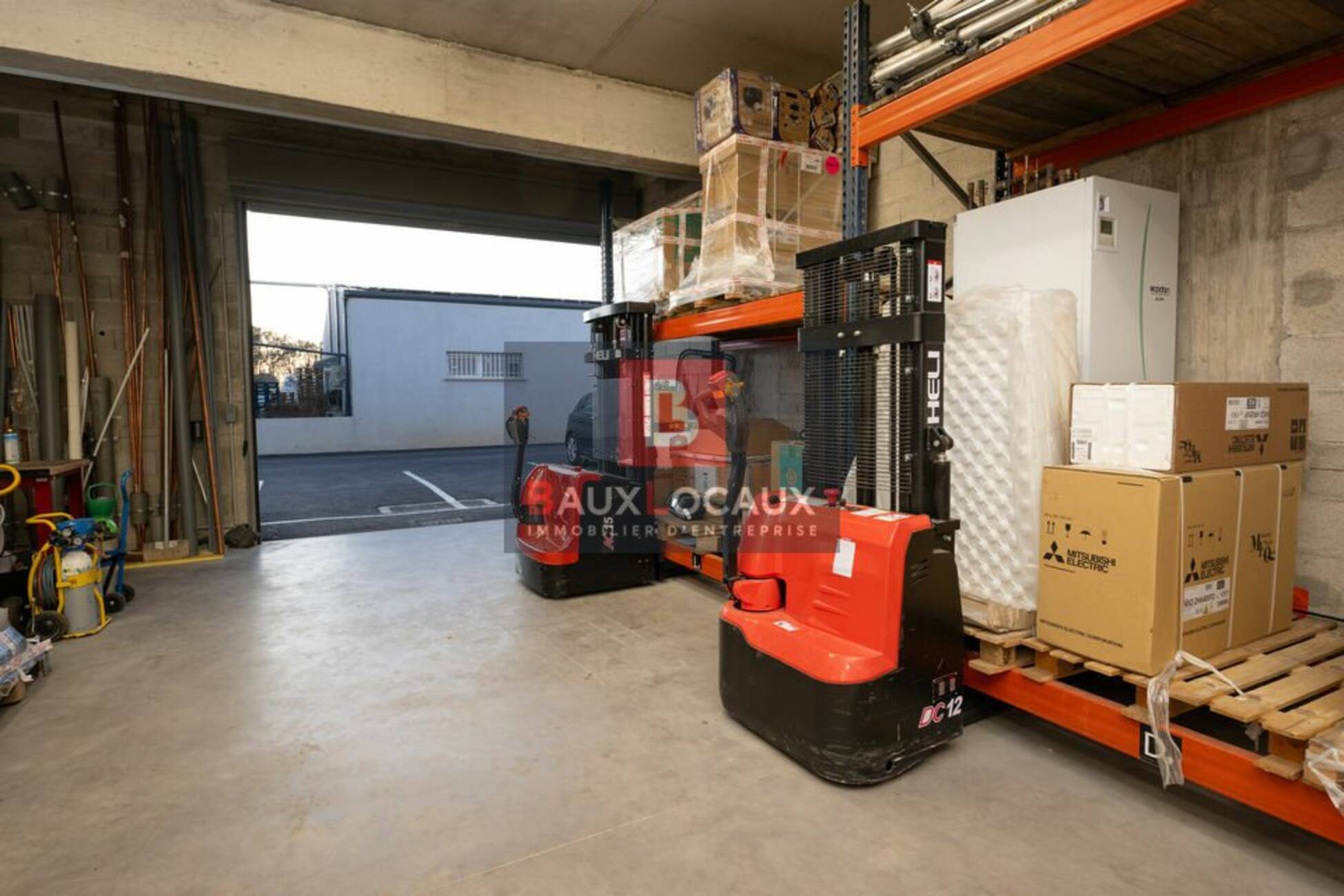 - Caractéristiques : équipé d'un rideau métallique thermolaqué motorisé (dimensions : 350 cm x 350 cm), porte de service, sol en dalle béton quartzé