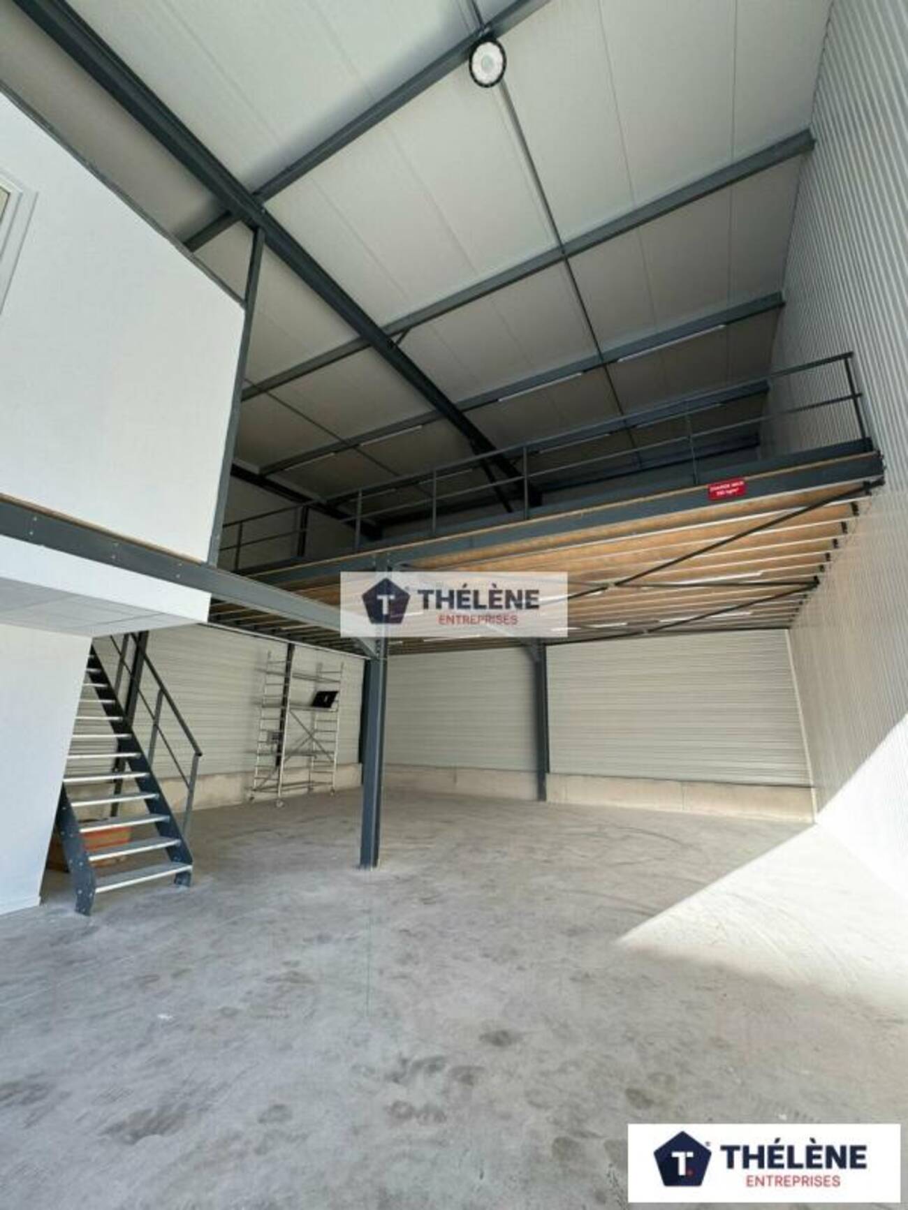 Mezzanine avec résistance de 250 kg/m², idéale pour stocker des palettes (accès facilité par élévateur).